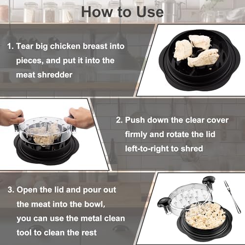HOW TO USE: We need to cook meat first and cut it into small pieces, forbid using raw meat to shred it, as it will damage the spike. The small pieces can be divided into 3 parts to put on the shredder, which can shred the meat finely and evenly. If you need different shredding states, you can twist it many times to get it. When its state is finished through visible clear lid, you can open the cover and put the meat into the bowl to make your delicious food