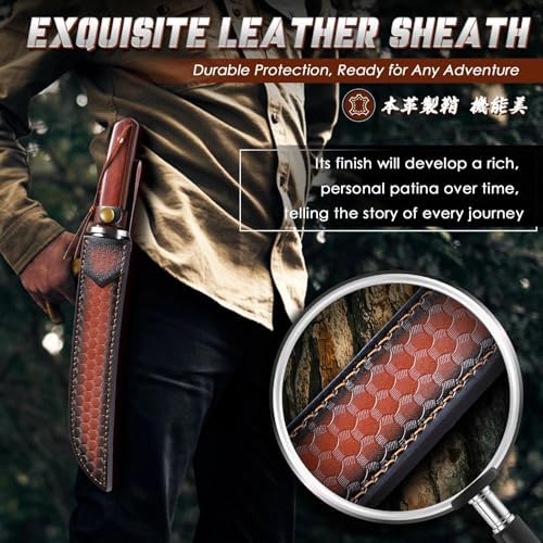 PREMIUM LEATHER SHEATH: Your fixed blade knife is safeguarded by a form-fitted, full-grain leather sheath. It reliably protects the edge from damage and the elements, while its sturdy belt loop ensures secure and convenient access wherever your adventures take you.