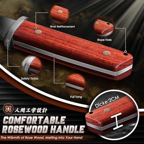 ERGONOMIC ROSEWOOD HANDLE: This isn’t just a handle; it’s your point of control. The ergonomically rosewood commands authority, offering a non-slip, fatigue-free grip in wet, cold, or muddy conditions. Paired with the secure lanyard system, it transforms the survival knife into a precise and confident instrument for your most demanding tasks.