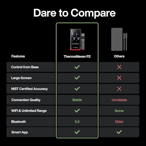 Smart Display Base: Unlike other thermometers that require an app to function, the P2’s smart base provides direct target temperature setting and real-time readings display. For advanced features like cooking history and AI-guided cooking, the free ThermoMaven APP (iOS/Andriod) is also available, giving you the best of both worlds.