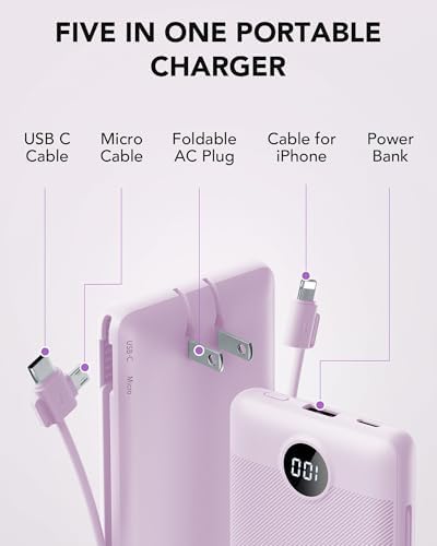 [Portable Charger With Built-in Cables and AC Wall Plug] This portable charger is not only has a built-in Micro cable, USB C cable, and other charging cable for iPhone, but also is equipped with a USB port,and USB C port. Also, Portable phone charger is built-in wall plug that charges the power bank itself directly from the wall outlet.