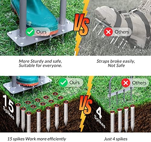 HIGH-EFFICIENCY 15 SHARP SPIKES DESIGN:Walensee lawn aerator tools have 15 sharp tines, 2.8 inches in length. Compared with 4 spikes coring aerator, the 15 spikes work at the same time, which can greatly improve work efficiency and save you time and effort. No more thinking about plastic or metal lawn aerator shoes, what size of spiked shoes, bid farewell to the instability and fragility of spike shoes, and say goodbye to discomfort.