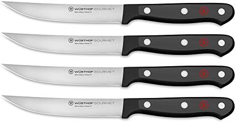 WÜSTHOF GOURMET SERIES – 4 Piece Steak Knife Set with triple riveted synthetic polypropylene handles that resist fading, discoloration, heat and impact. Precisely laser-cut stamped knives offer superb quality and value