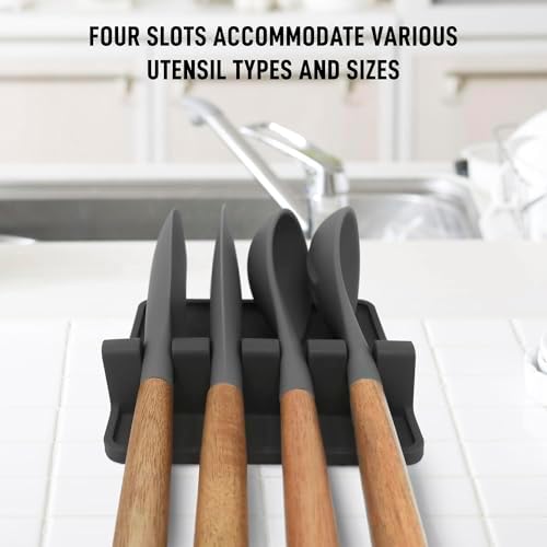 HEAT RESISTANT AND EASY TO CLEAN: Made from food-grade material, this silicone spoon rest can be placed near the stove or countertop without it being affected by heat. It is designed with a non-slip base to prevent it from sliding and causing chaos while cooking. Once you are done with cooking, toss the kitchen tool holder in the dishwasher for a quick cleanup.